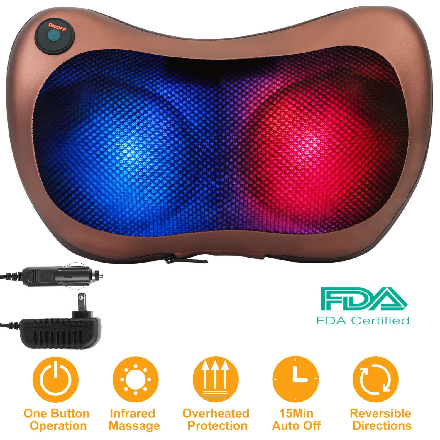 Are you suffering the sore of neck and shoulder due to the long seating working? Are you sored of muscles due to high-intensity sport? Do you feel back stiffness due to overtime driving? If yes, our neck massage pillow can help you. 15-Minute auto off and auto reversible directions, adopts infrared warming technology with 3 modes to provide a soothing and invigorating heat that delivers a warm and gentle massage to boost blood circulations. Leave your muscles relaxed while getting rid of all aches and fatigue. Ergonomic design and easy operation to fit perfectly for your whole body and a superior gift for your coworkers, friends, parents and etc.. Install on your car seat and on your chair.