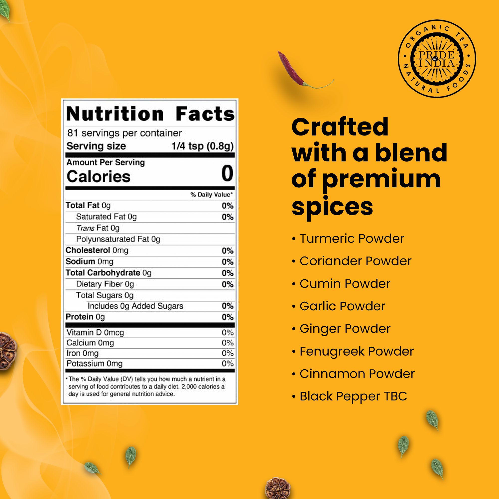 8 GOURMET SPICE BLEND: Experience a culinary adventure with our Turmeric Tandoori Rub, a mesmerizing fusion of eight gourmet spices meticulously blended to perfection. This exquisite combination includes the earthy warmth of Coriander Powder, the zesty kick of Cumin Powder, the aromatic richness of Garlic and Ginger Powder, the subtle sweetness of Fenugreek Powder, the woody charm of Cinnamon Powder, the bold intensity of Black Pepper, and the vibrant golden hue of Turmeric Powder. Together, these premium spices create a flavor profile that's both complex and harmonious, evoking the enchanting essence of tandoori cuisine.