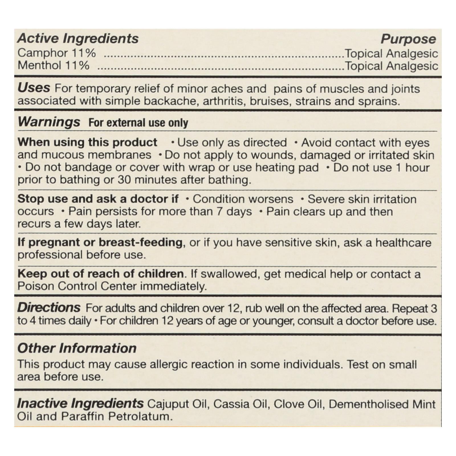 ingredients : drug facts active camphor 11% purpose topical analgesic menthol 11% purpose topical analgesic;inactive cajuput oil;cassia oil;clove oil;dementholised mint oil and paraffin petrolatum